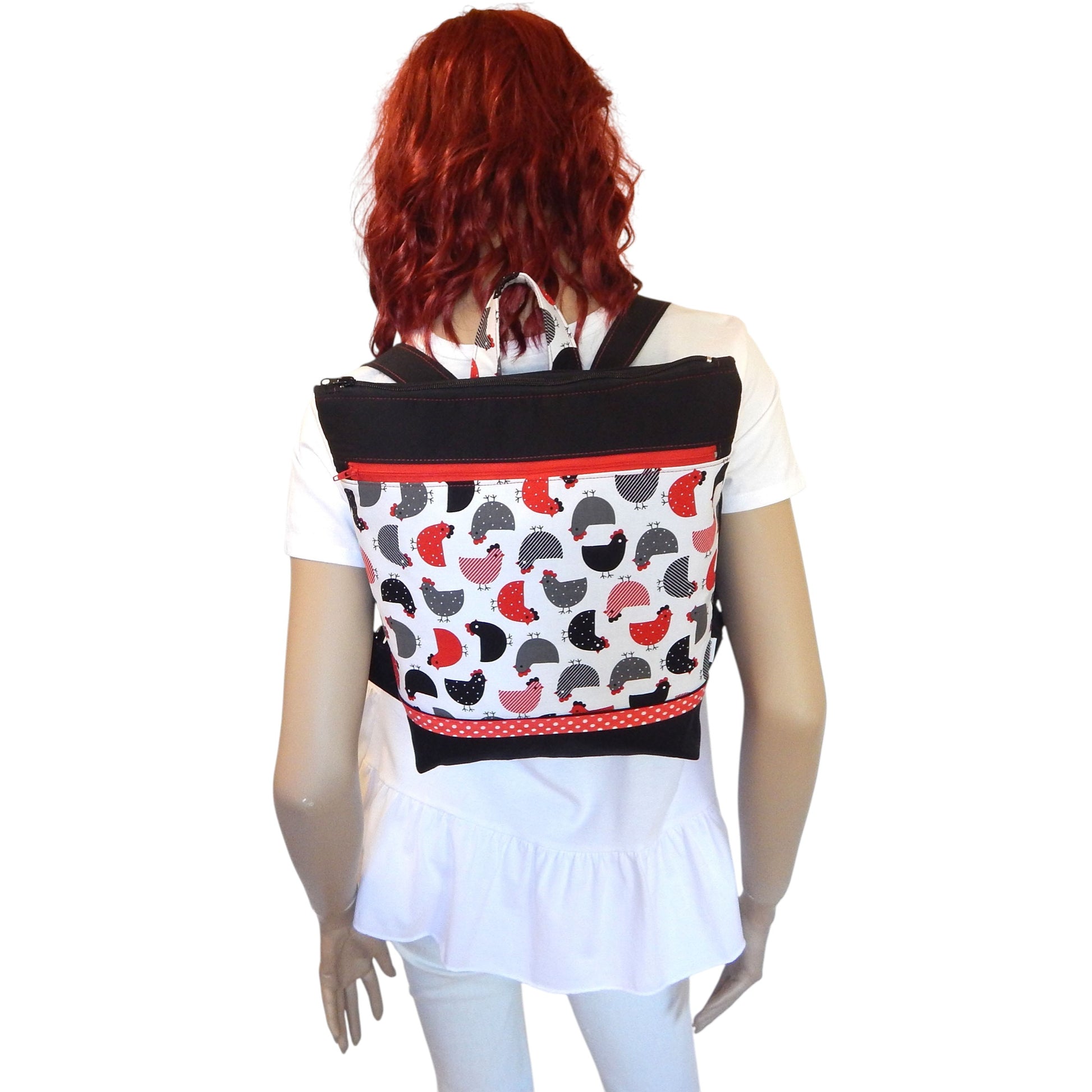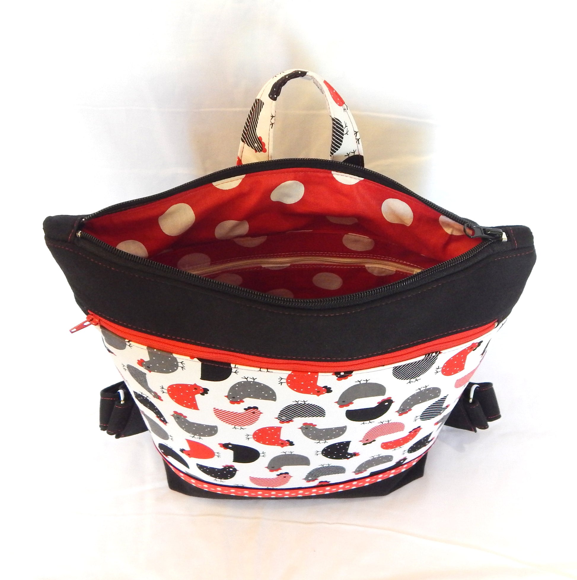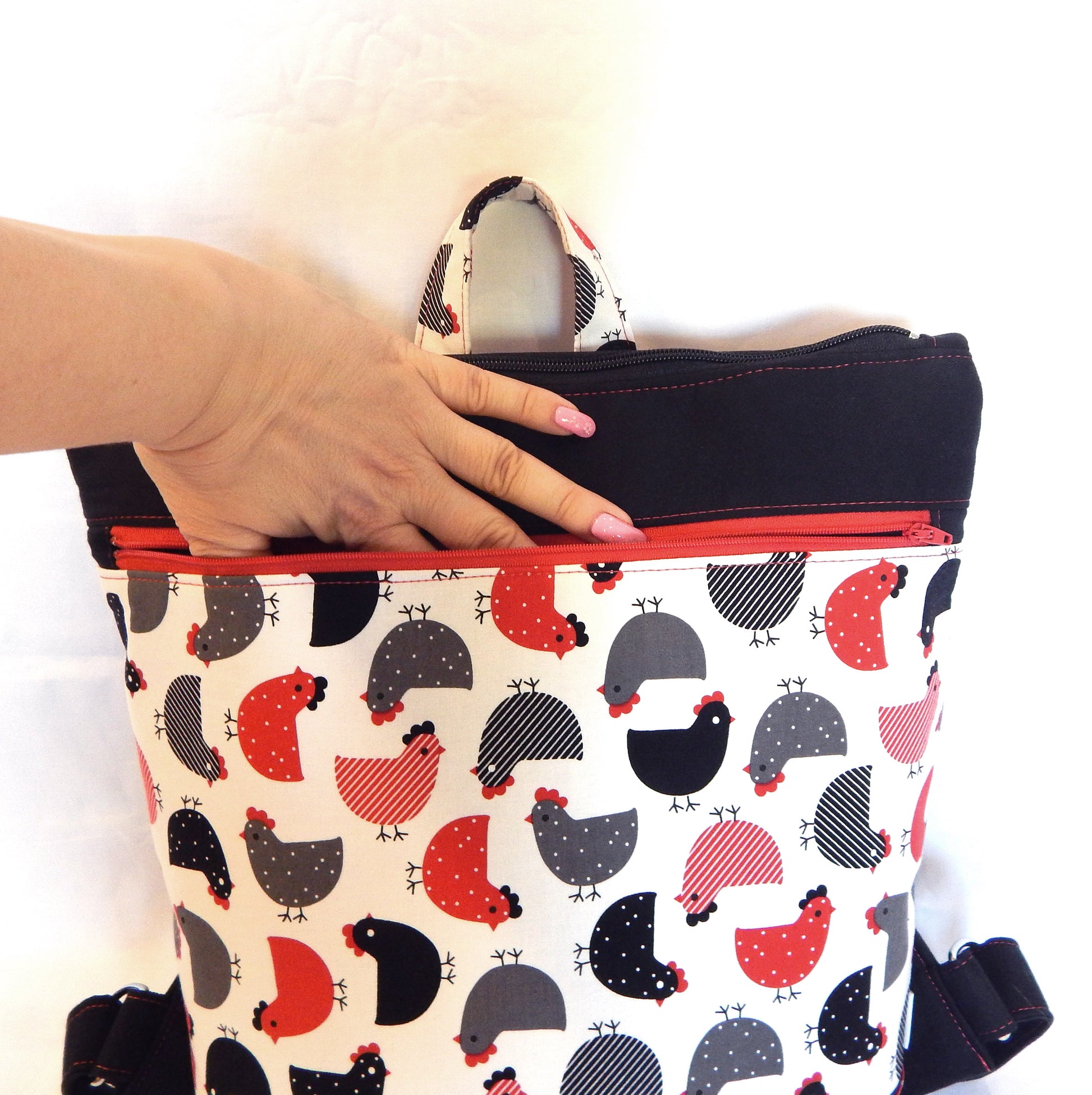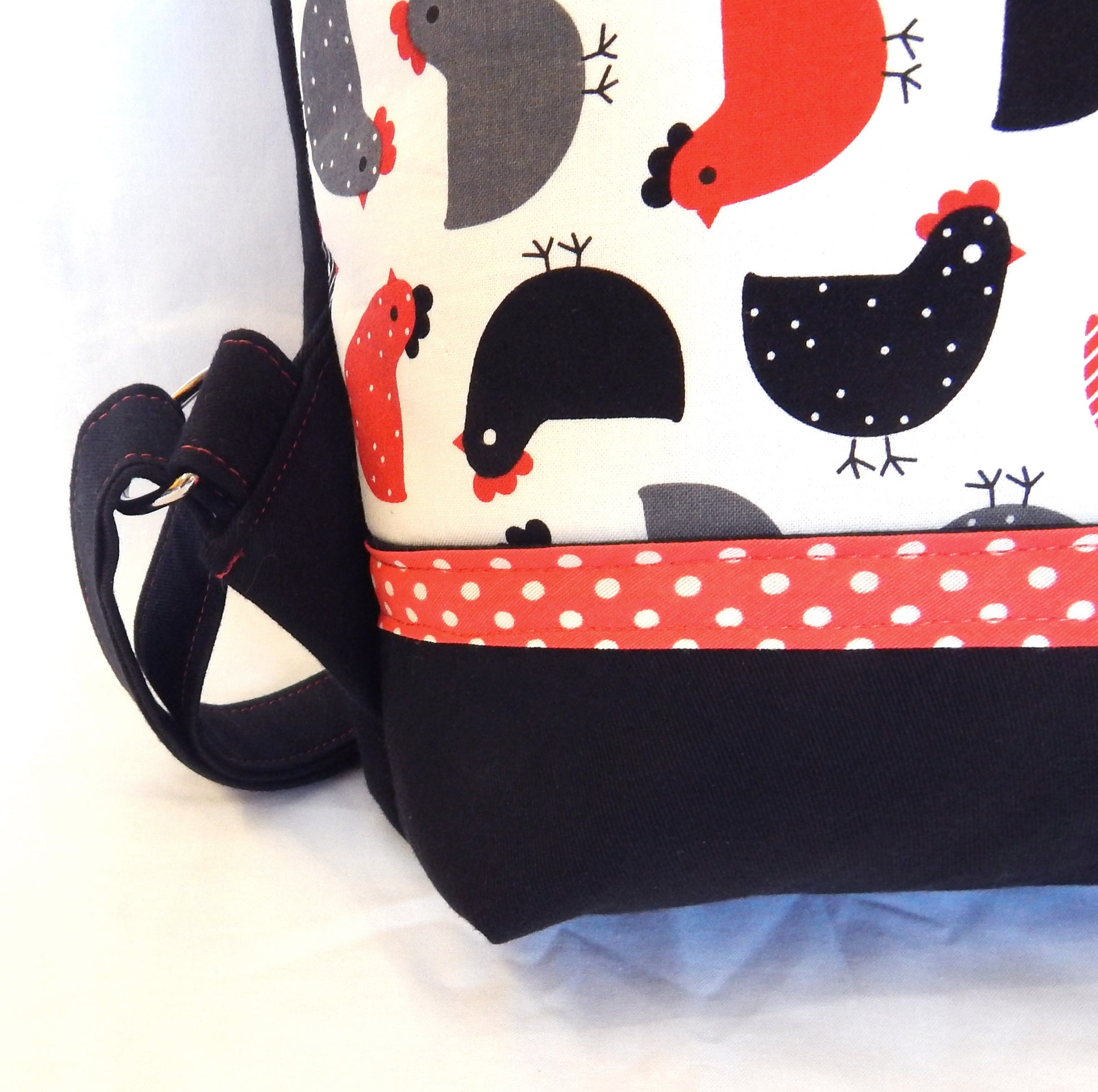 This medium-sized chicken print backpack is handmade from durable cotton canvas and twill, featuring a playful red polka dot lining—perfect for chicken lovers, quirky fashion fans, or anyone who adores farm-inspired accessories.