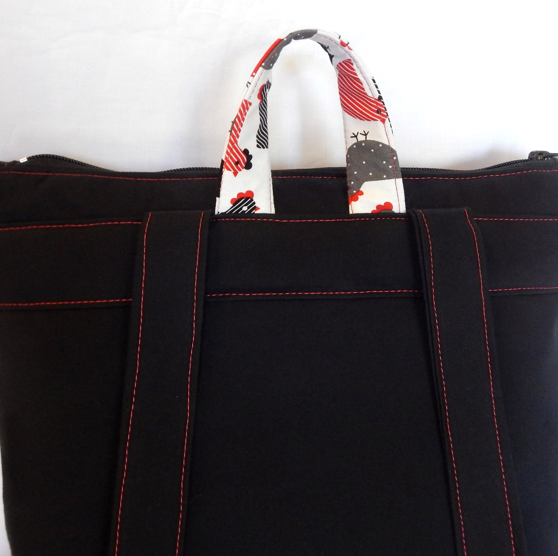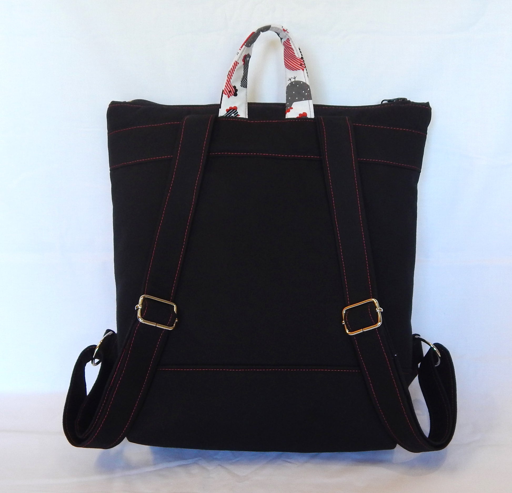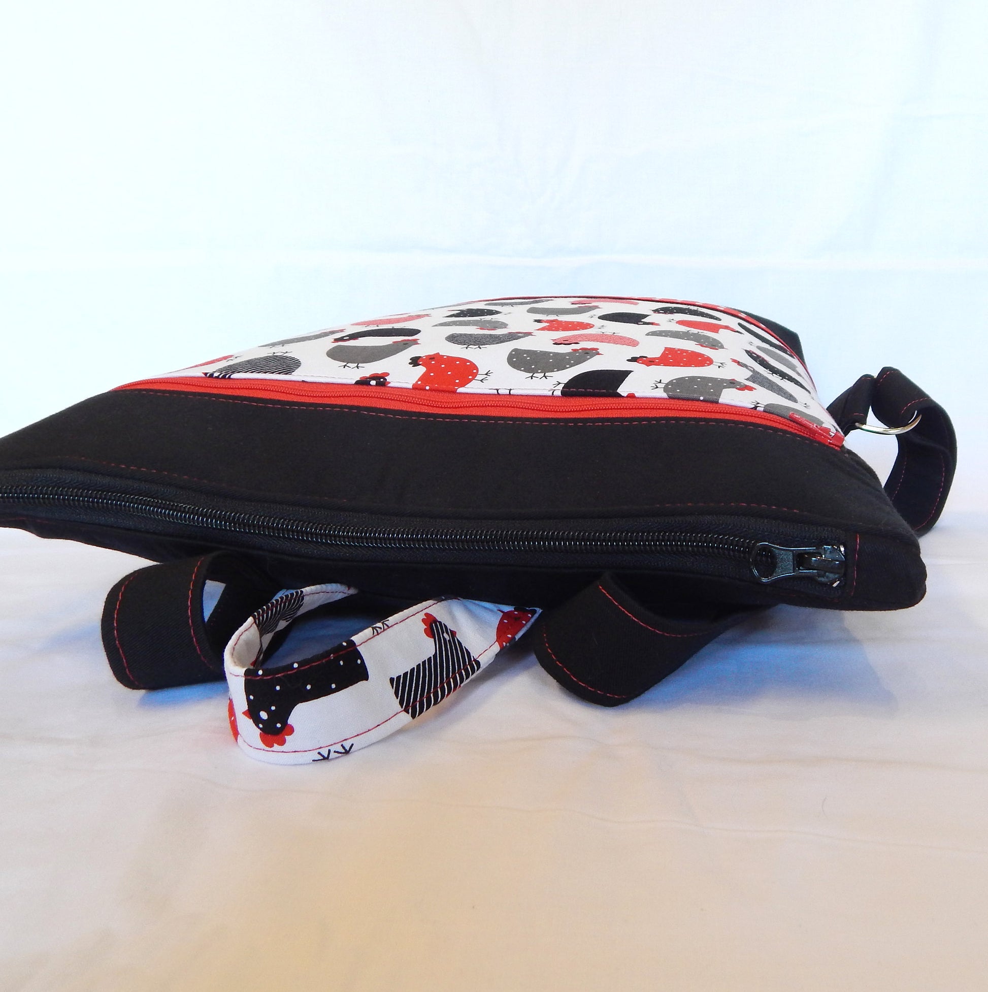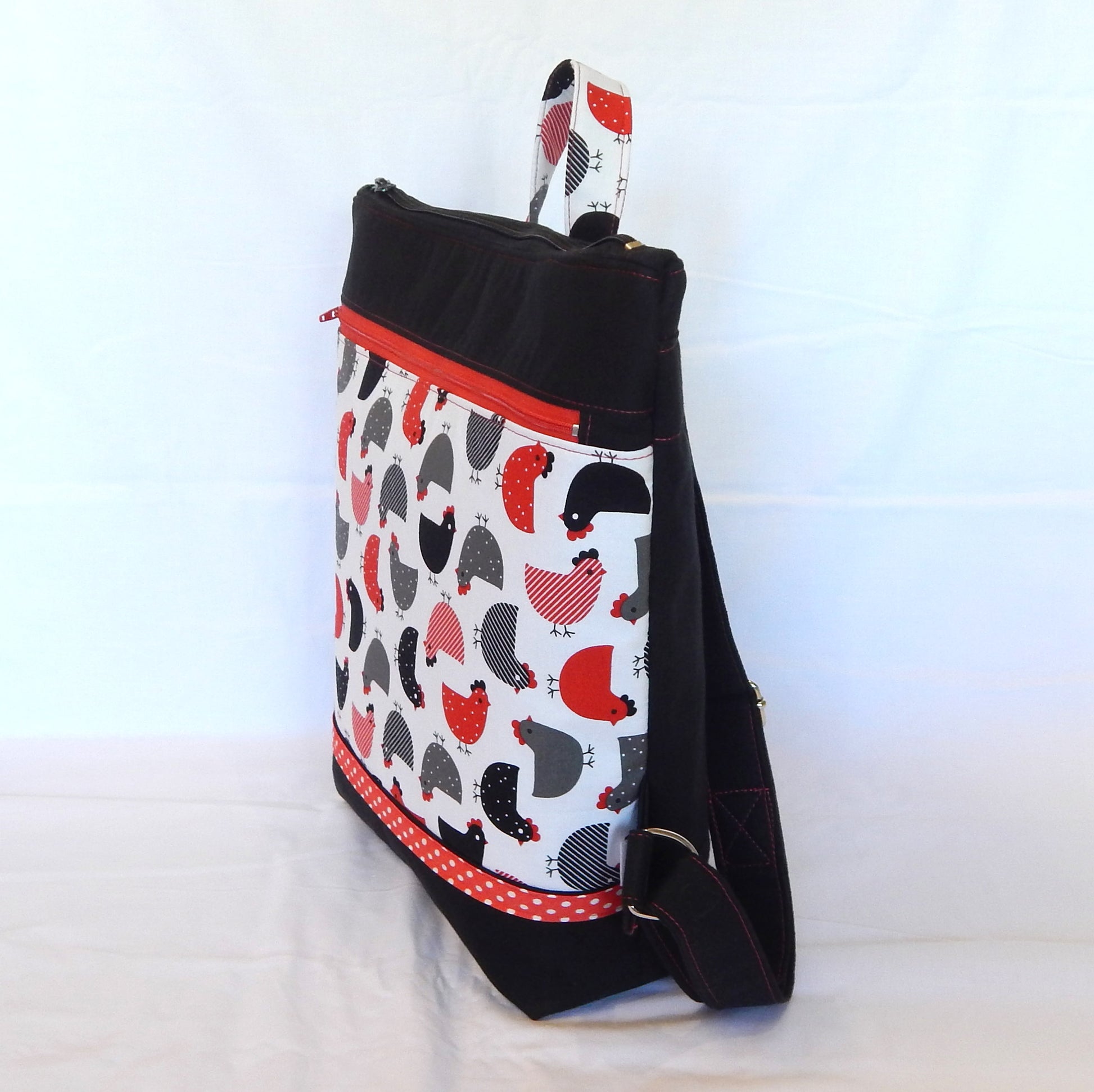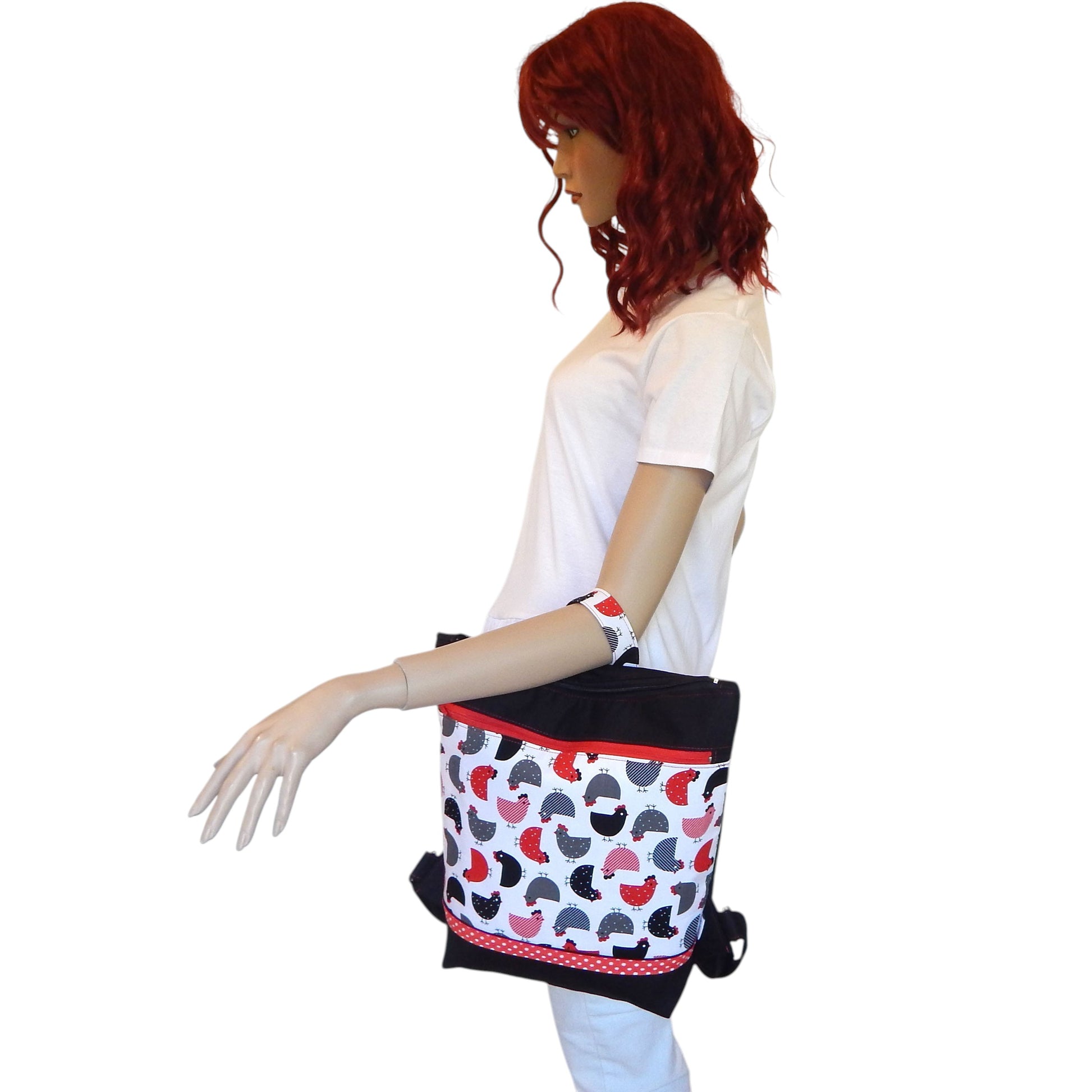 This medium-sized chicken print backpack is handmade from durable cotton canvas and twill, featuring a playful red polka dot lining—perfect for chicken lovers, quirky fashion fans, or anyone who adores farm-inspired accessories.