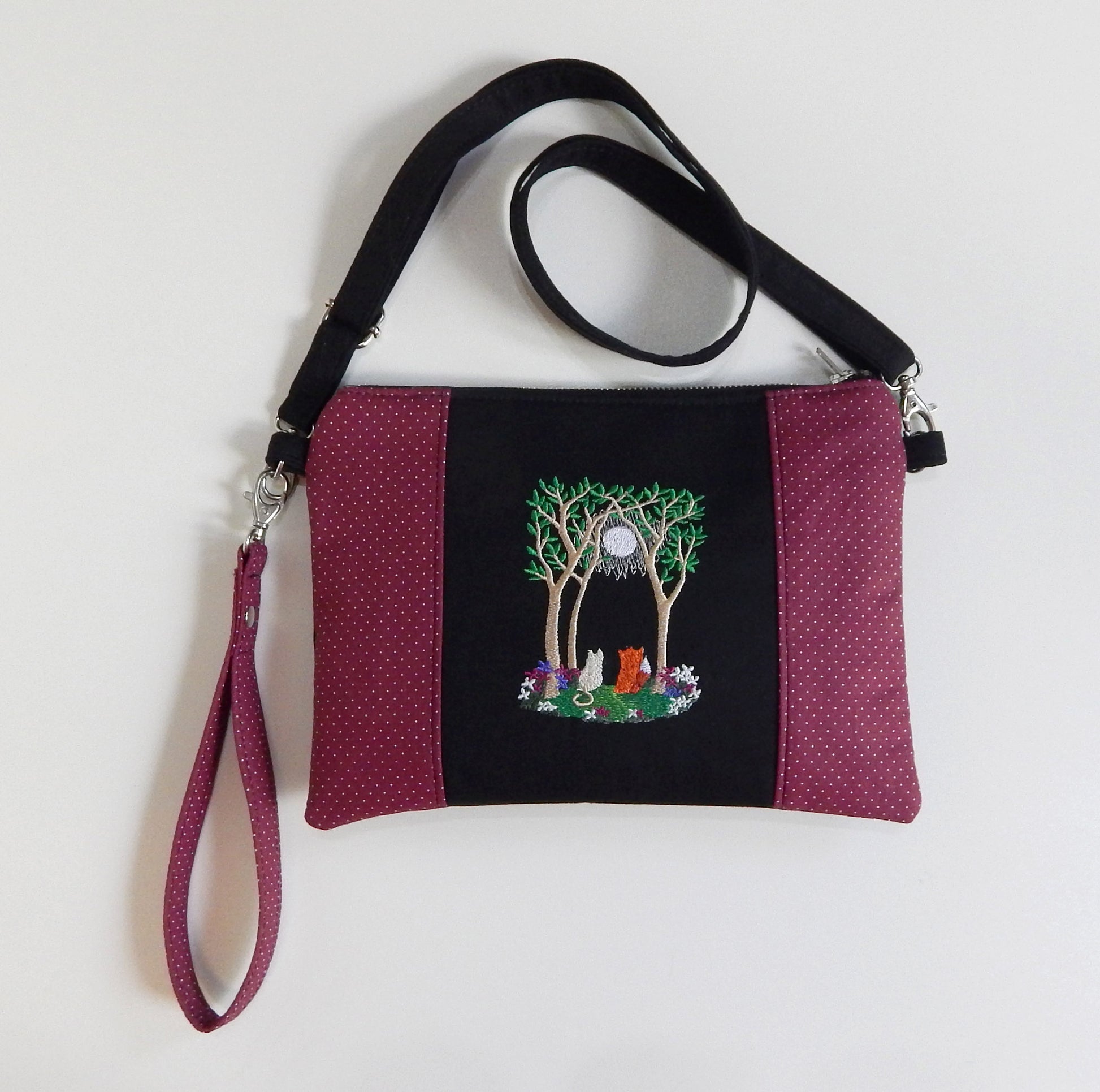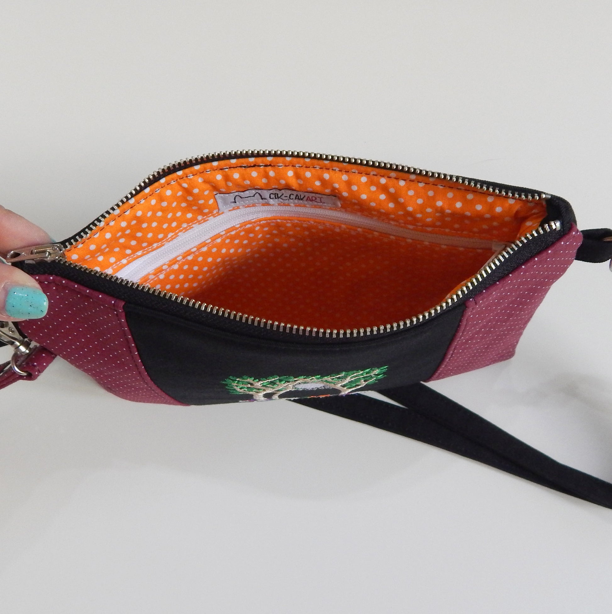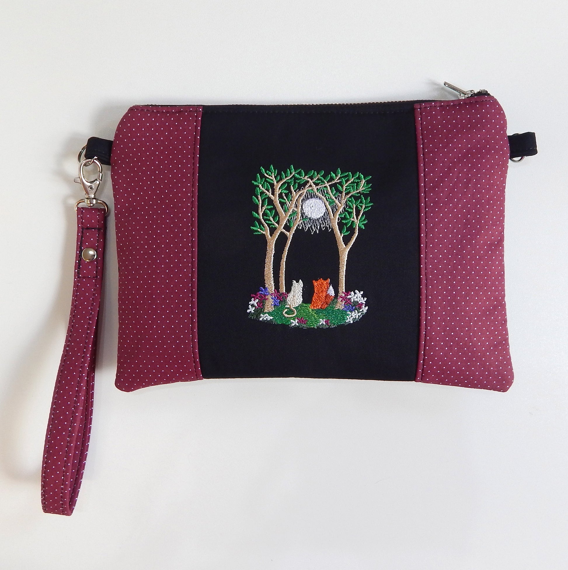 Wristlet cat and fox handbag made of black cotton twill (mix cotton-polyester twill) and wine red polka dot cotton canvas , the cat, fox and forest is machine embroidered . The bag is lined with orange color polka dot print cotton canvas lining and has a zippered closure on the front.