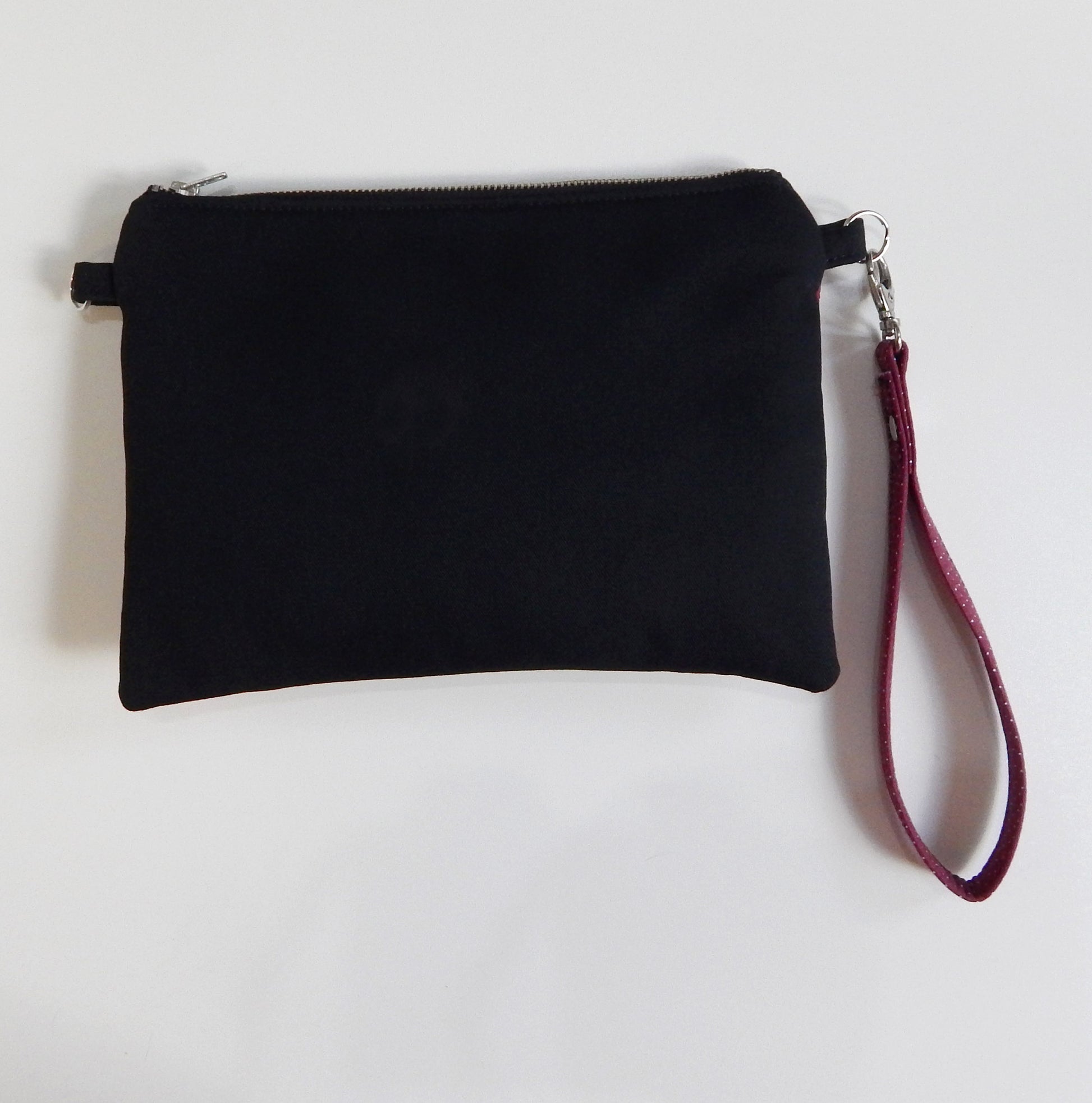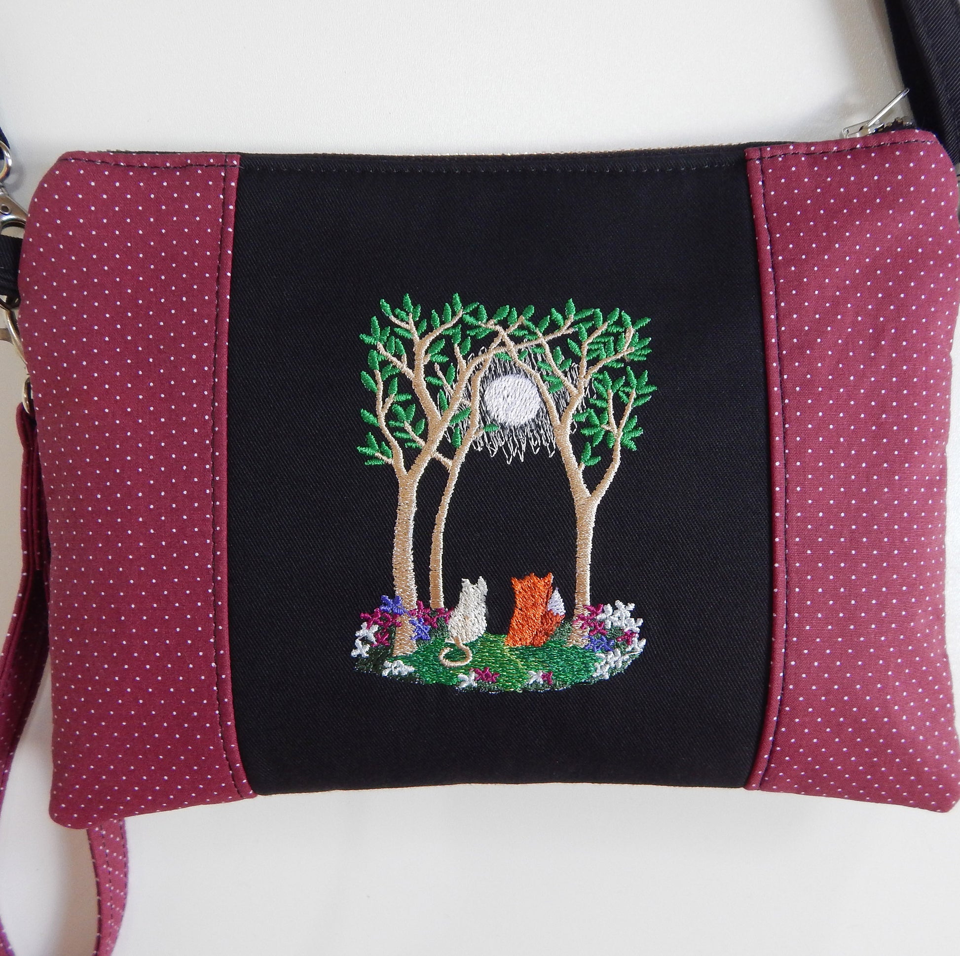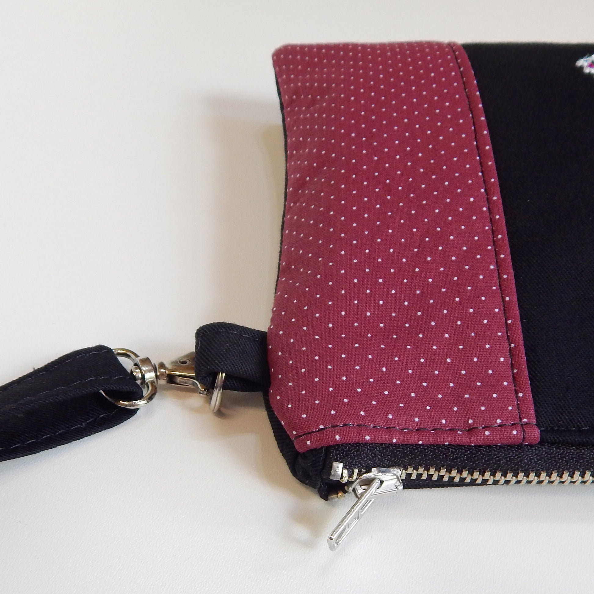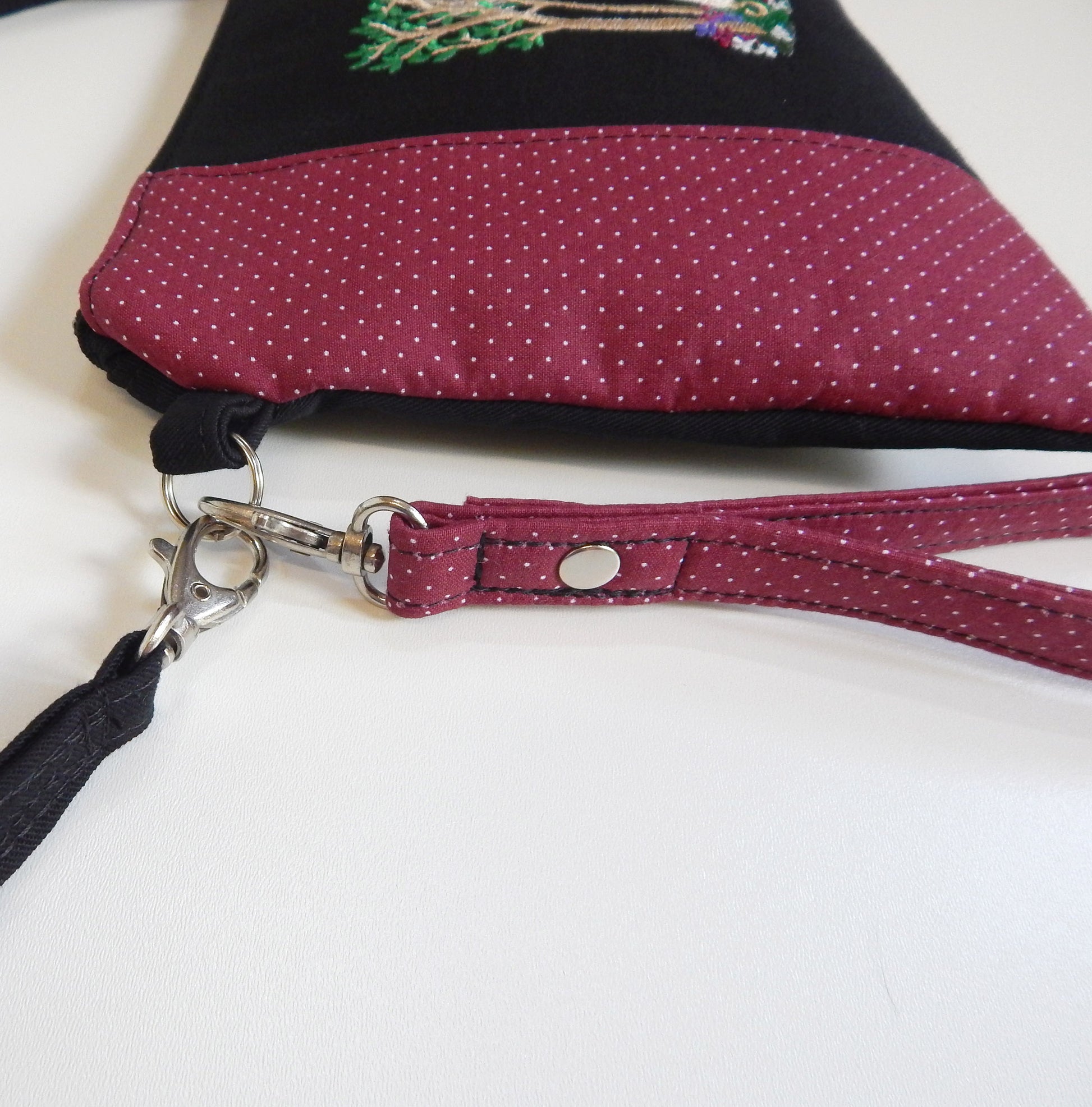 Wristlet cat and fox handbag made of black cotton twill (mix cotton-polyester twill) and wine red polka dot cotton canvas , the cat, fox and forest is machine embroidered . The bag is lined with orange color polka dot print cotton canvas lining and has a zippered closure on the front.