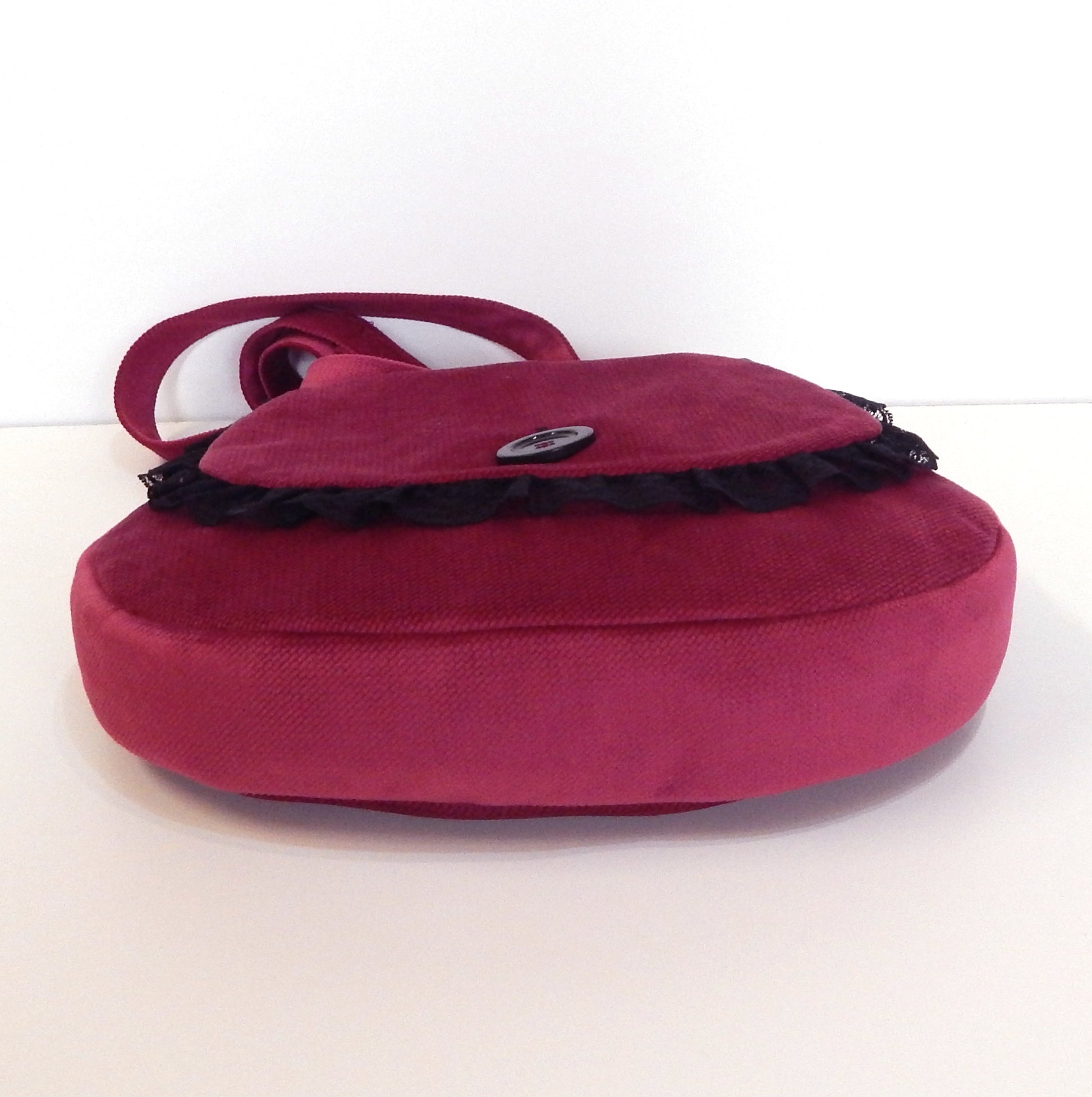 Bag's cover on the front edged with beautiful black lace and buttoning with one big black button .