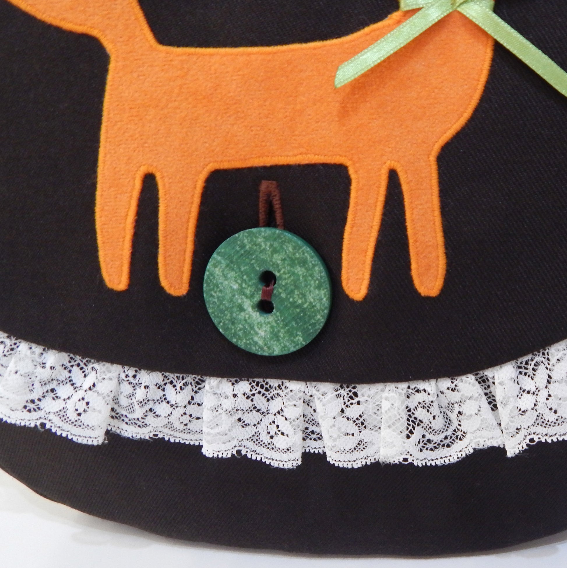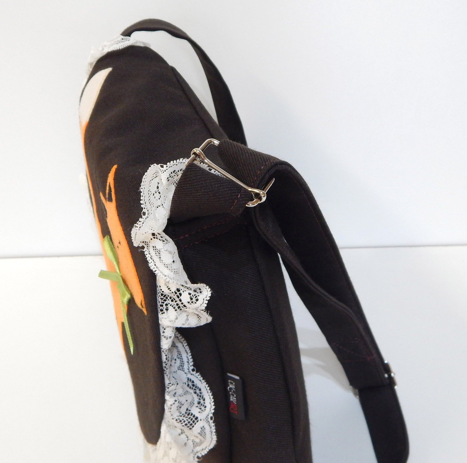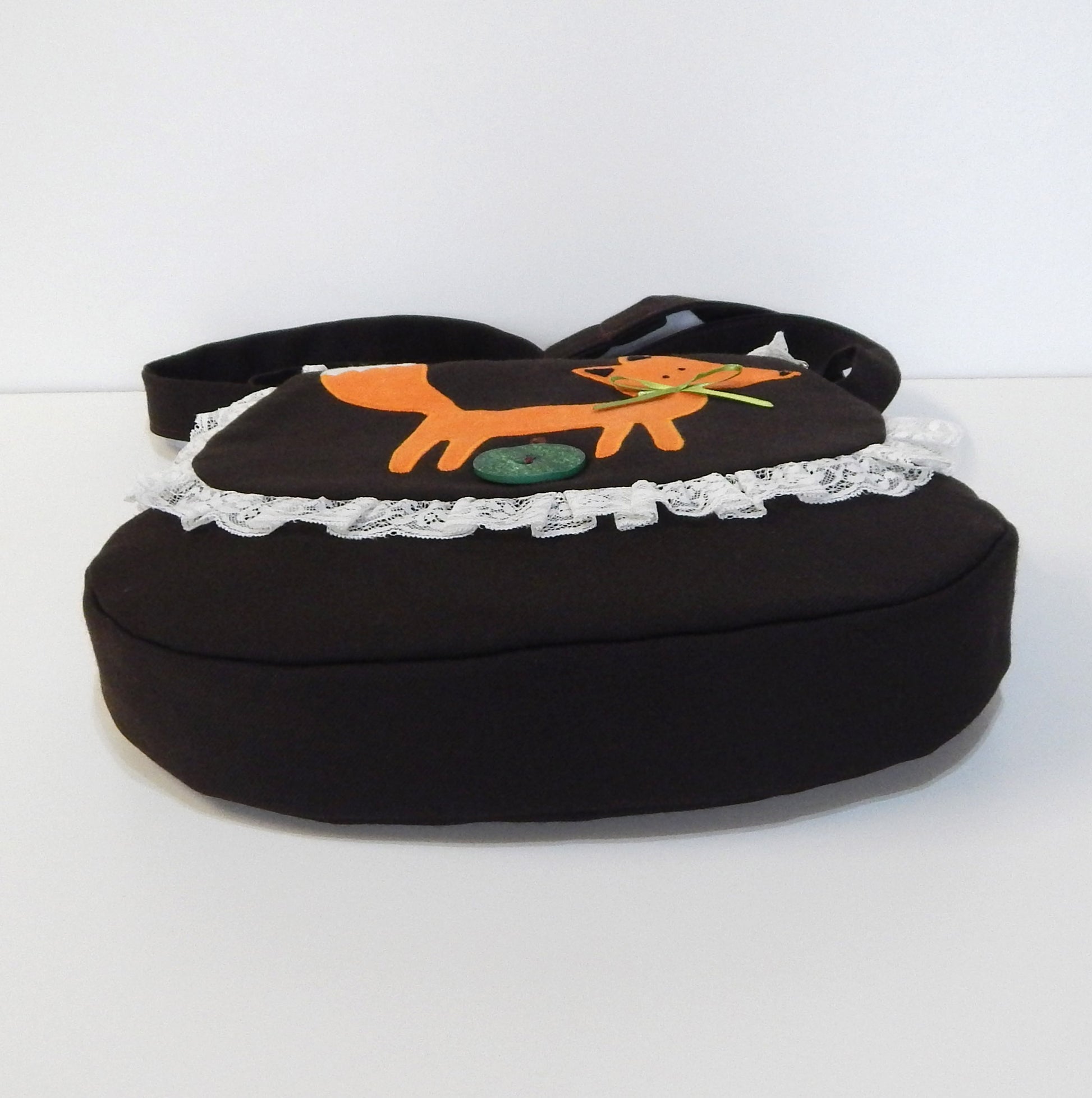 This handmade crossbody bag features dark brown wool fabric, velour fox applique with green ribbon, lace trim and polka dot lining – a charming woodland-inspired gift or everyday purse for animal lovers.