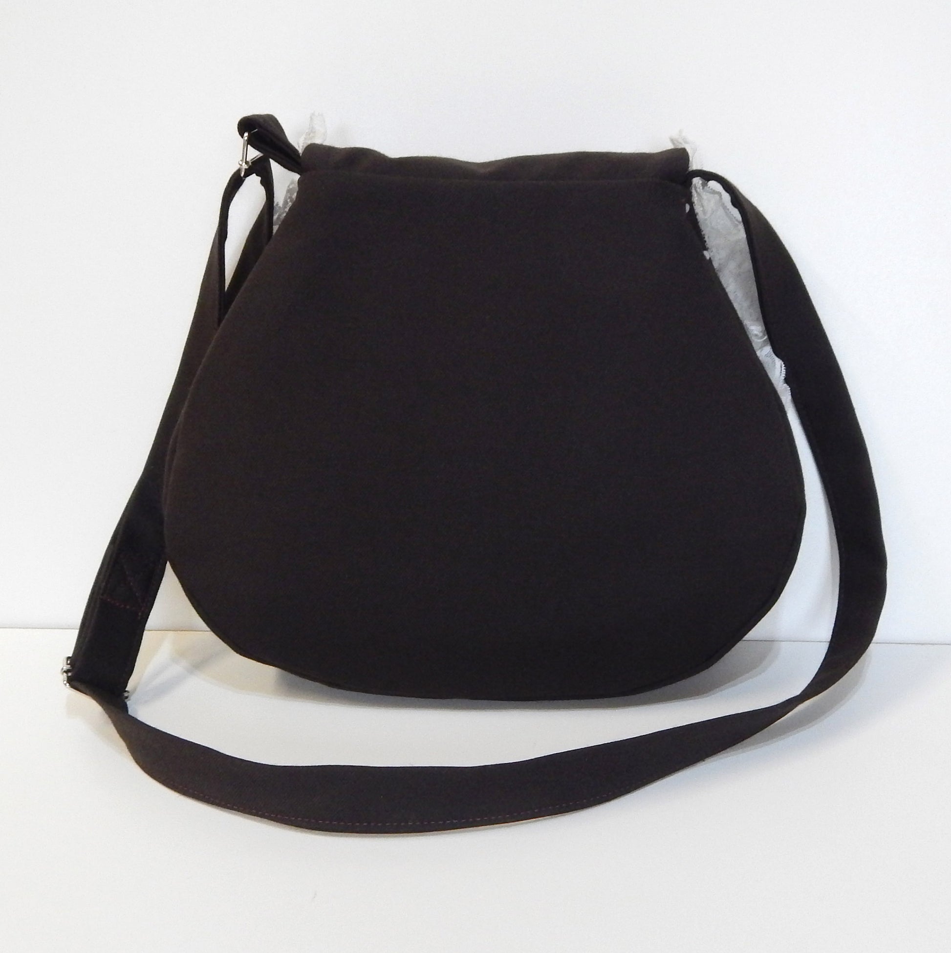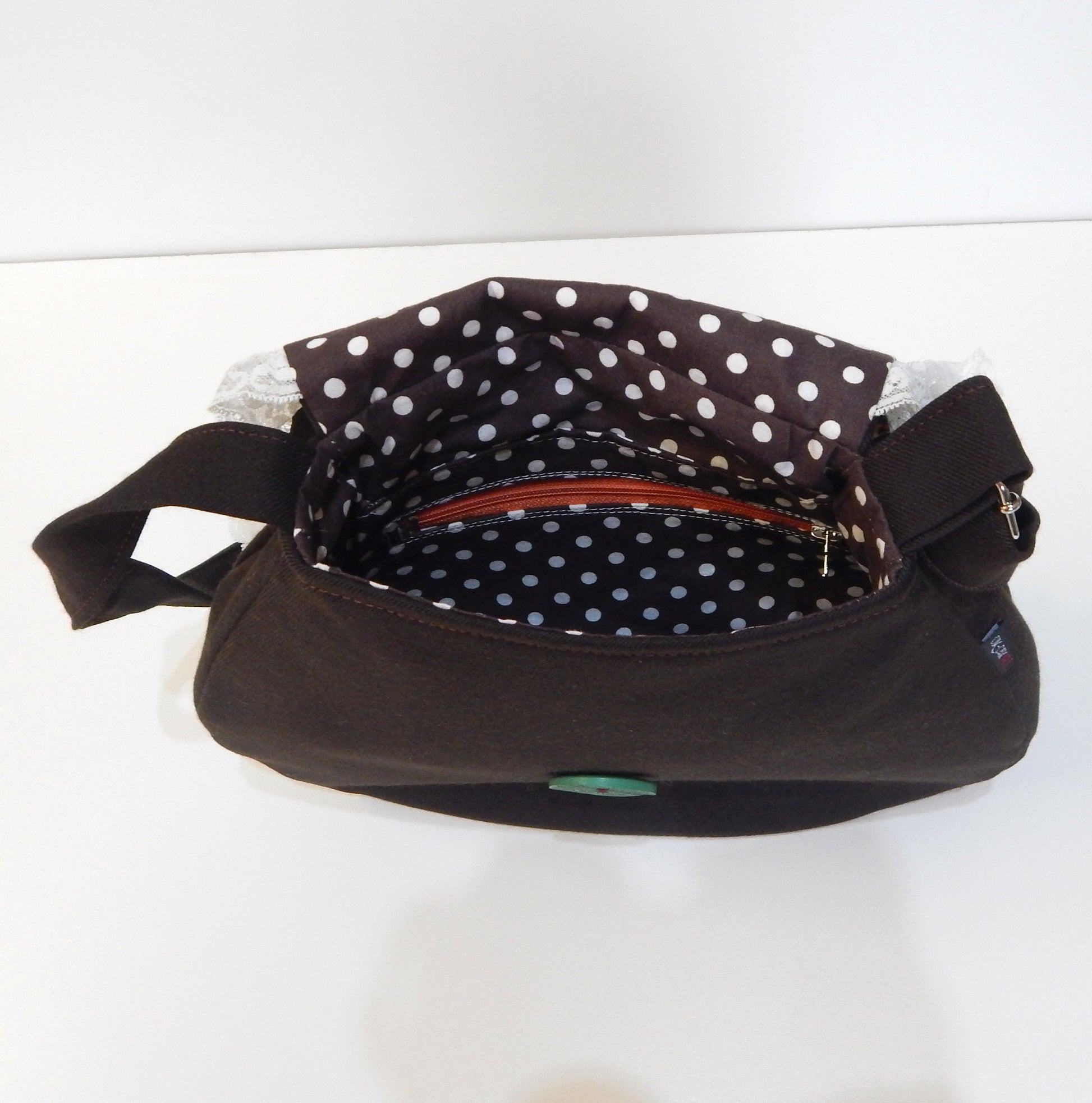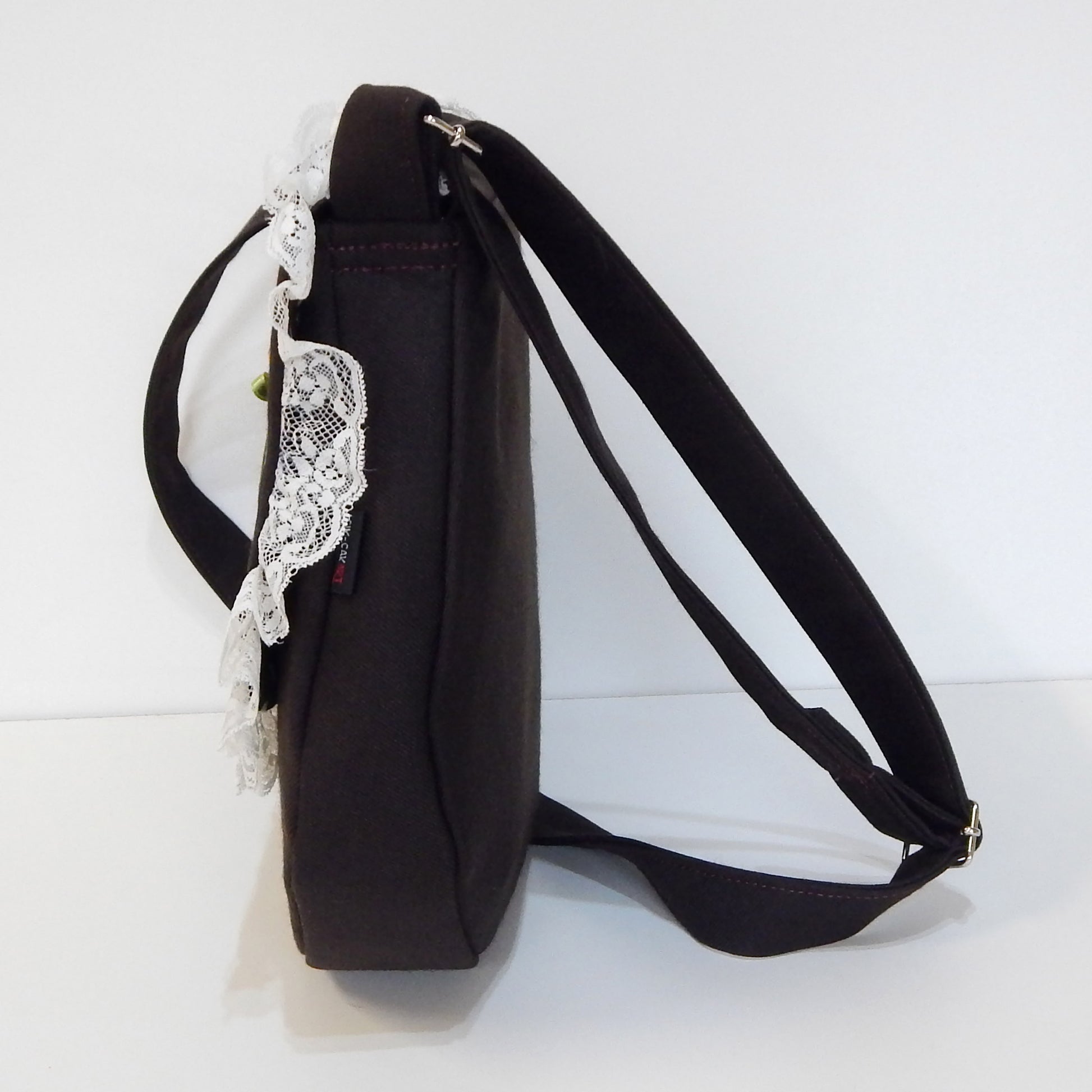 This handmade crossbody bag features dark brown wool fabric, velour fox applique with green ribbon, lace trim and polka dot lining – a charming woodland-inspired gift or everyday purse for animal lovers.