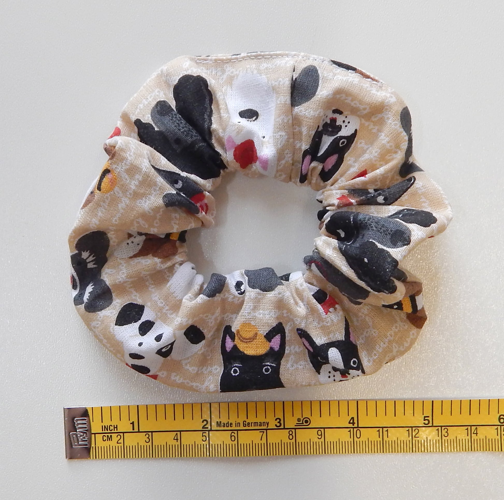 This is a set of 3 scrunchies: dogs in beige color, dogs in gray color and beige with paws
